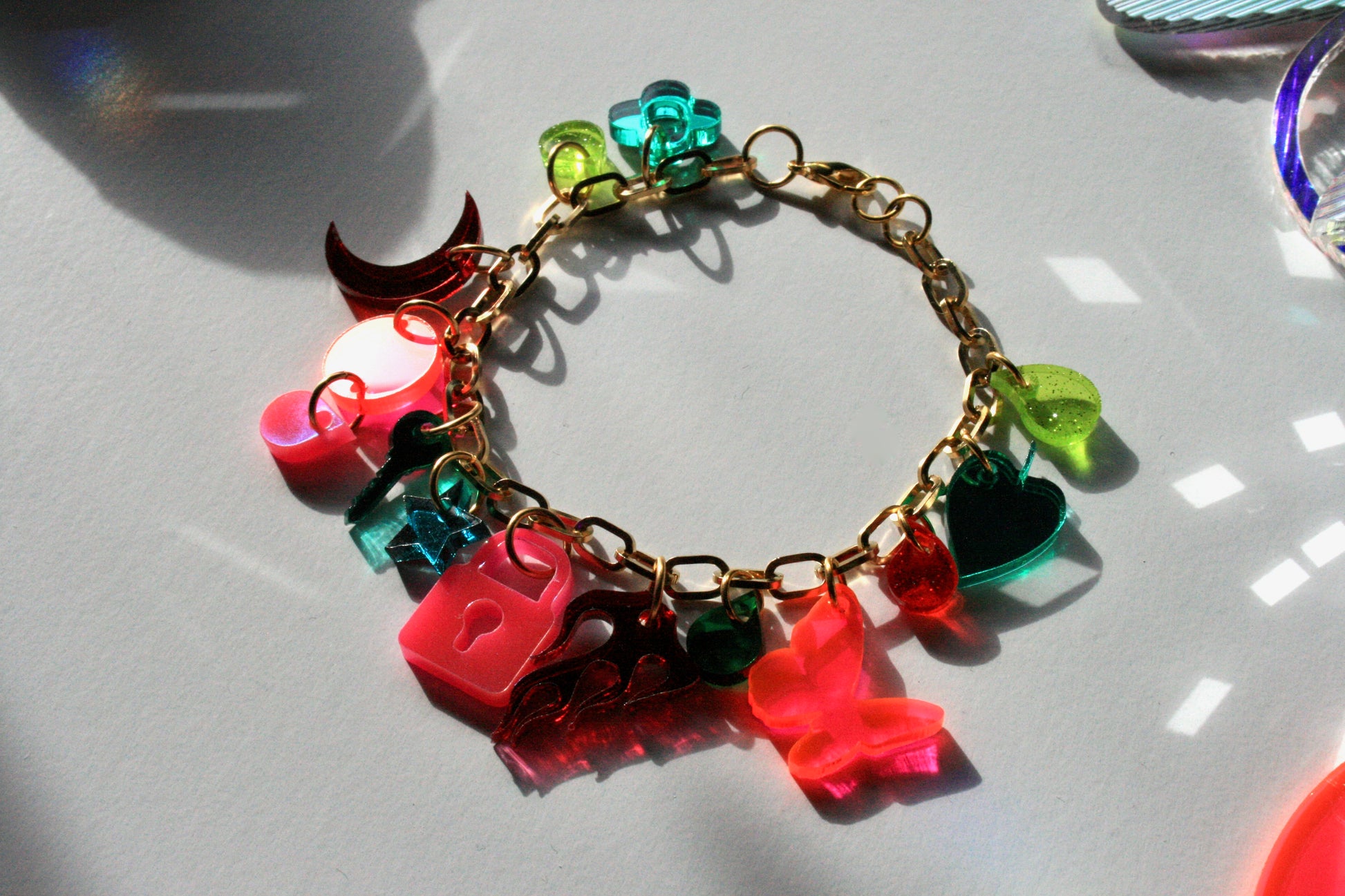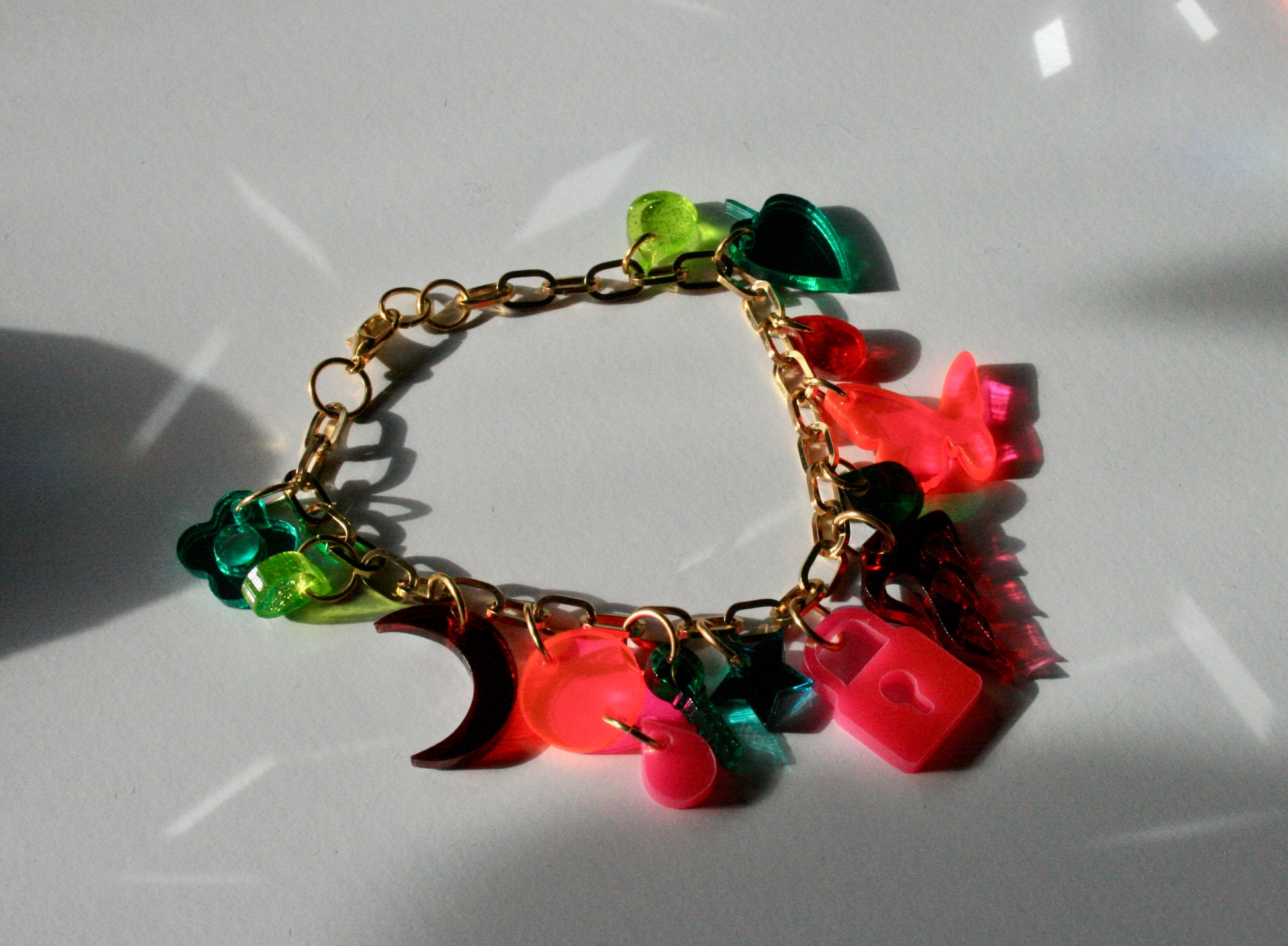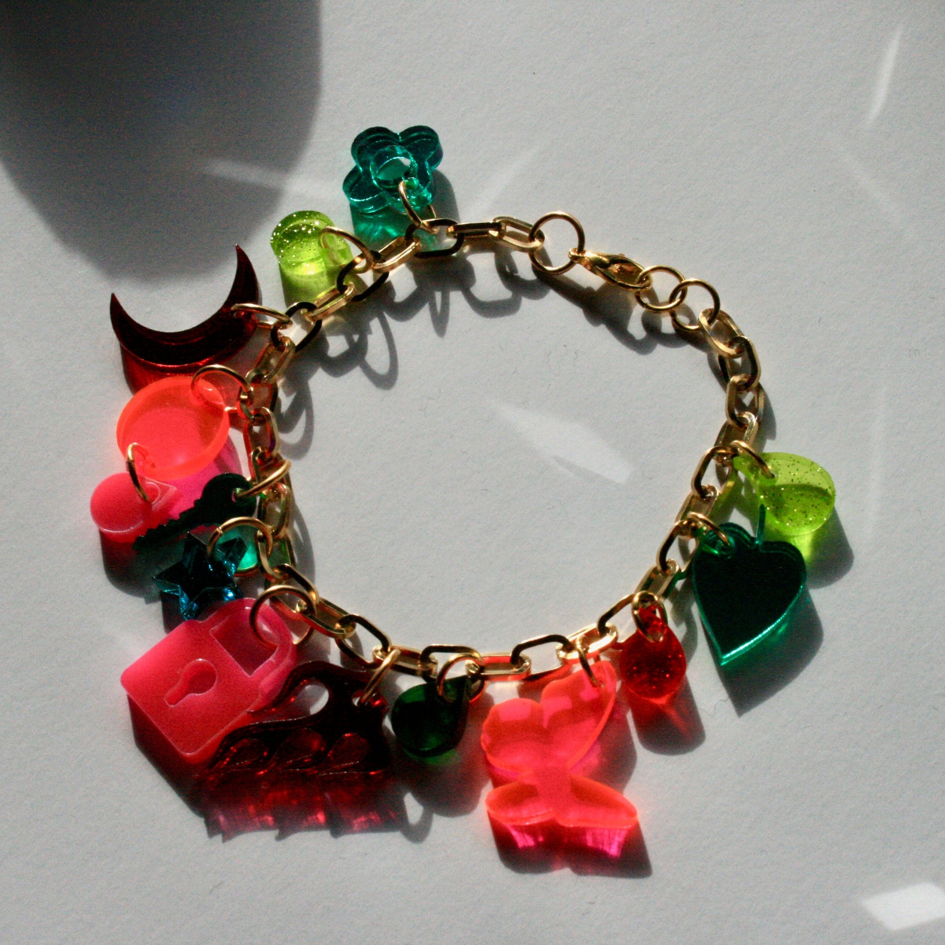 Pink and Green Charm Bracelet - Reflective Fluorescent Sparkly Colorful OOAK One of a Kind Detailed