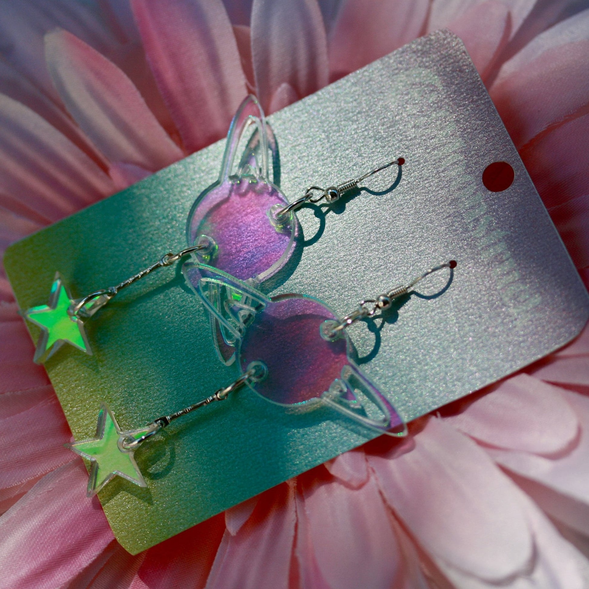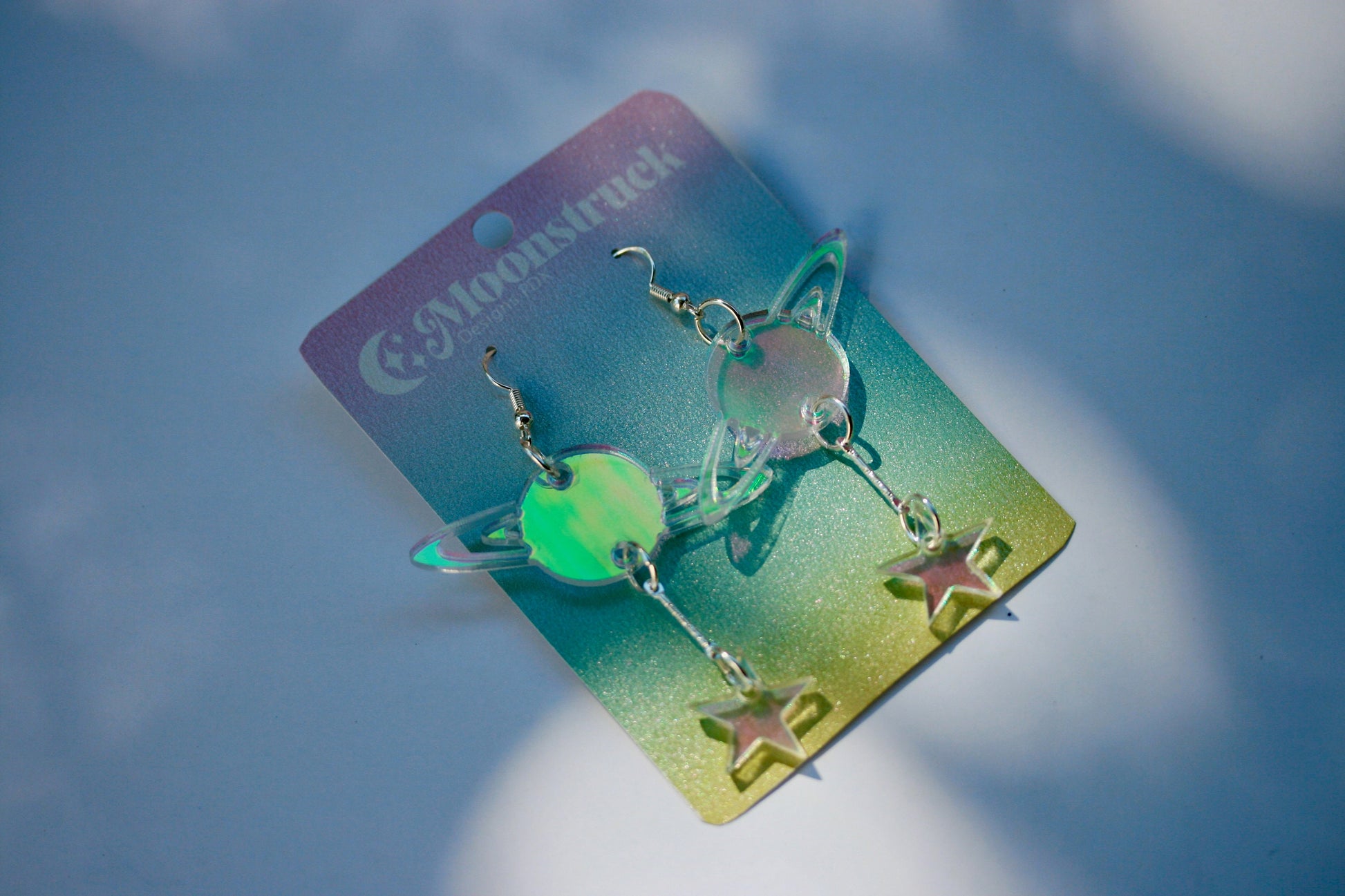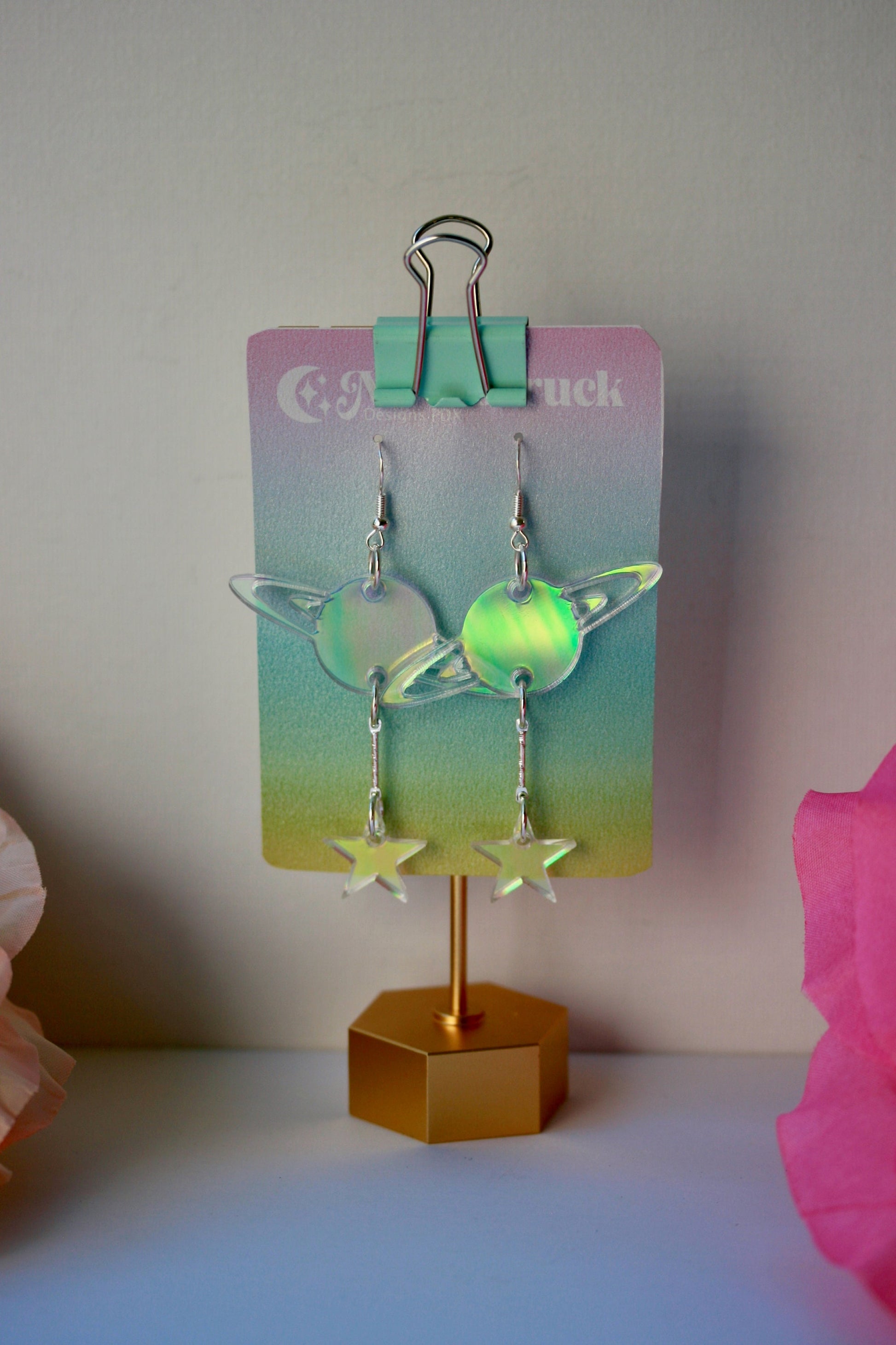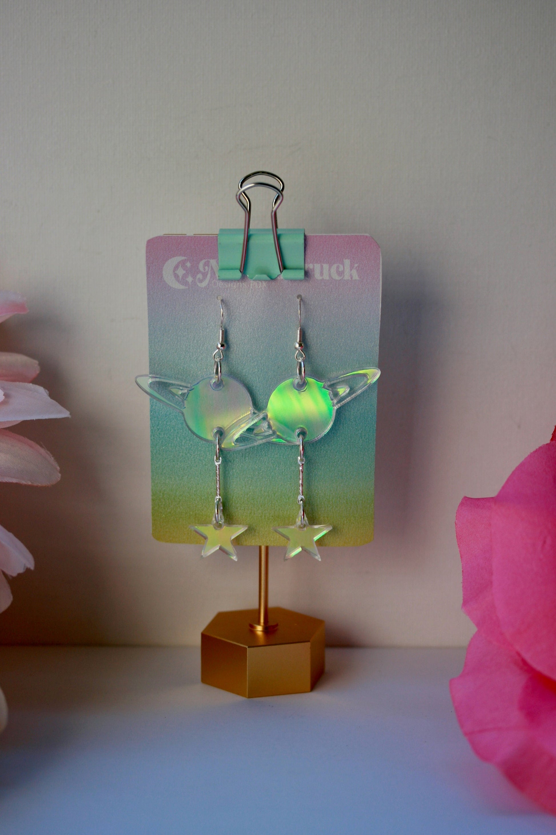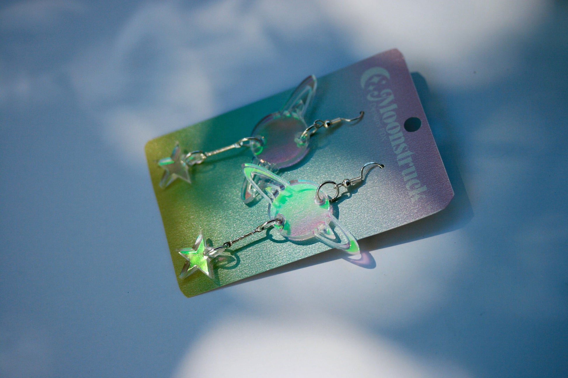 Saturn Earrings- Sky Celestial Earth Cosmic Solar System Planet Globe Blackhole Star Holo Lasercut Iridescent Reflective Rainbow Earrings